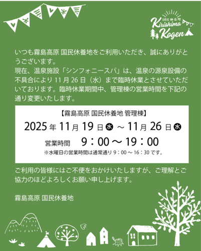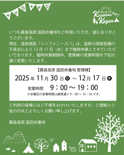 霧島高原国民休養地の温泉「シンフォニースパ」をご利用いただき、誠にありがとうございます。度重なる源泉の不具合により、 本日11月30日(日)から12月17日(月)まで臨時休業とさせていただきます。ご利用の楽しみされている皆様にはご迷惑をおかけし、大変心苦しい...