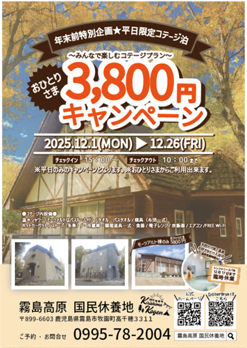 いつも霧島高原 国民休養地をご利用いただき、誠にありがとうございます。 12月1日(月)より26日(金)までの期間、平日限定でお得にご宿泊いただける 「おひとりさま3,800円キャンペーン」を実施いたします。-------------------------...