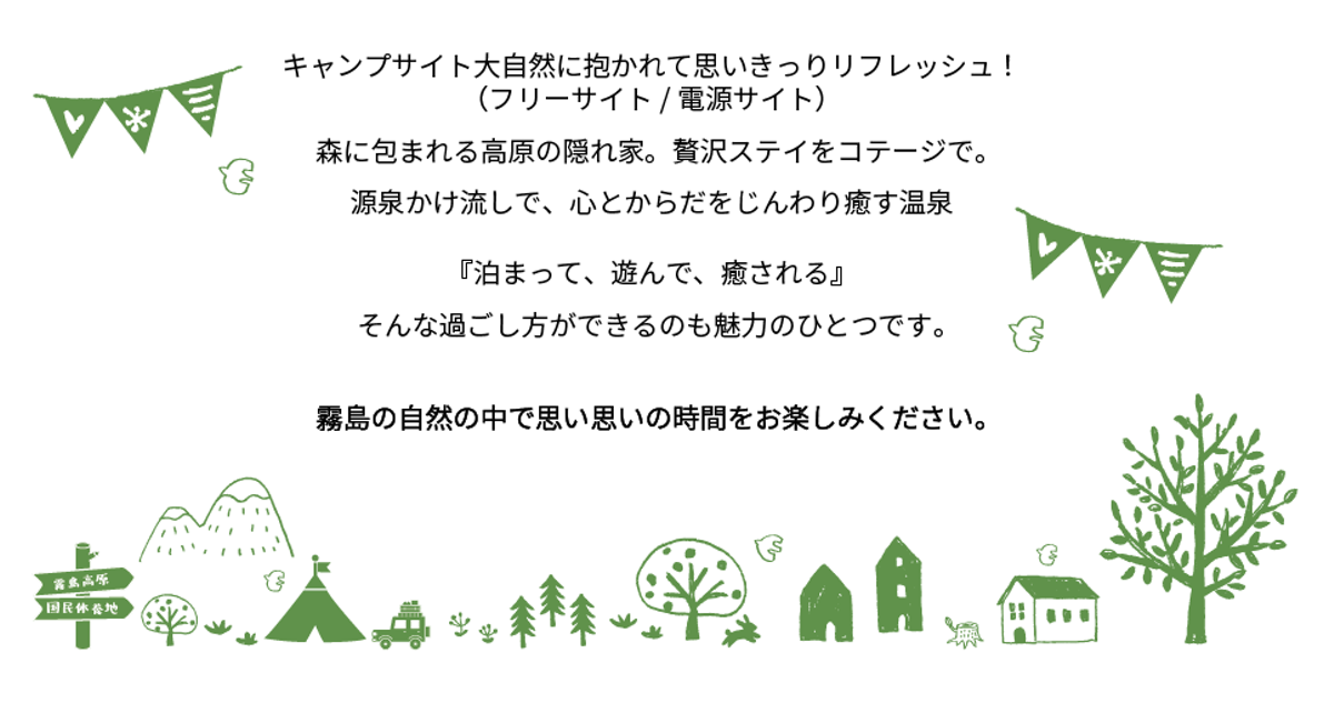 いつも霧島高原国民休養地をご利用頂き有難うございます。 当施設は、全施設年末年始も、全施設通常通り営業いたします。 ご家族やご友人とのひとときに、ぜひご利用ください。 皆様のお越しを心よりお待ちしております。 霧島高原国民休養地