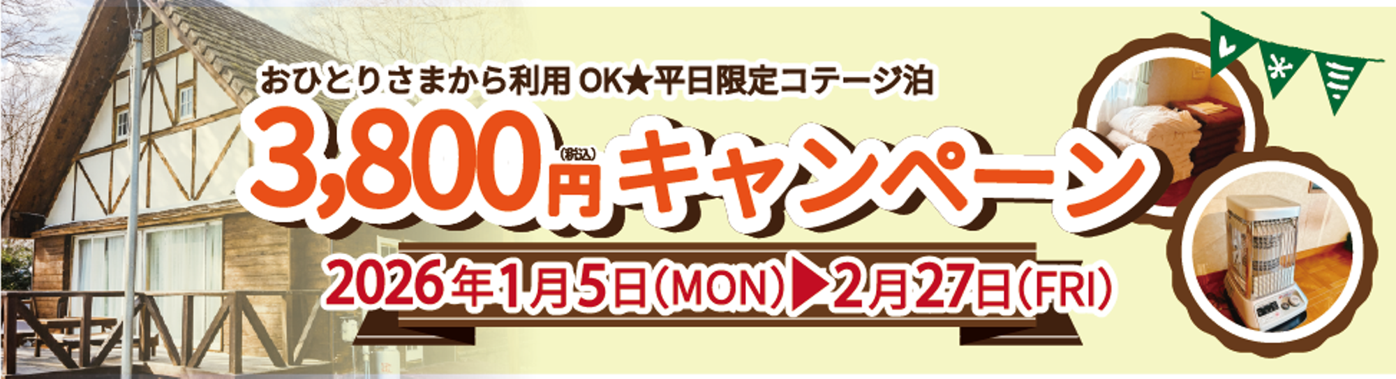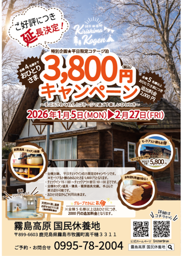 いつも霧島高原 国民休養地をご利用いただき、誠にありがとうございます。ご好評につきまして、「コテージ泊おひとりさま3,800円キャンペーン」は期間を延長することが決定いたしました。 期間中は、お得にご宿泊いただける特別企画です。団体様にもお得にご宿泊!! こ...