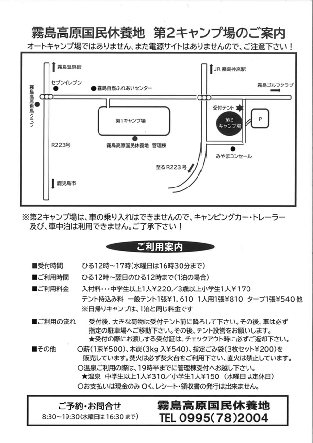 霧島高原国民休養地のキャンプ場は、過日開催された全国和牛能力共進会鹿児島大会の催事場として利用され、令和4年10月28日まで片付け作業が行われています。そのため、キャンプご利用の方へは、第2キャンプ場へご案内しています。詳しくは、下記をご覧下さい。オートキャンプ場ではありませんので、ご不便をおかけして申し訳ありません。尚、通常のキャンプ場は10月29日(土)~利用できます。
