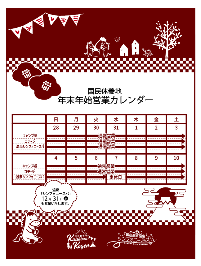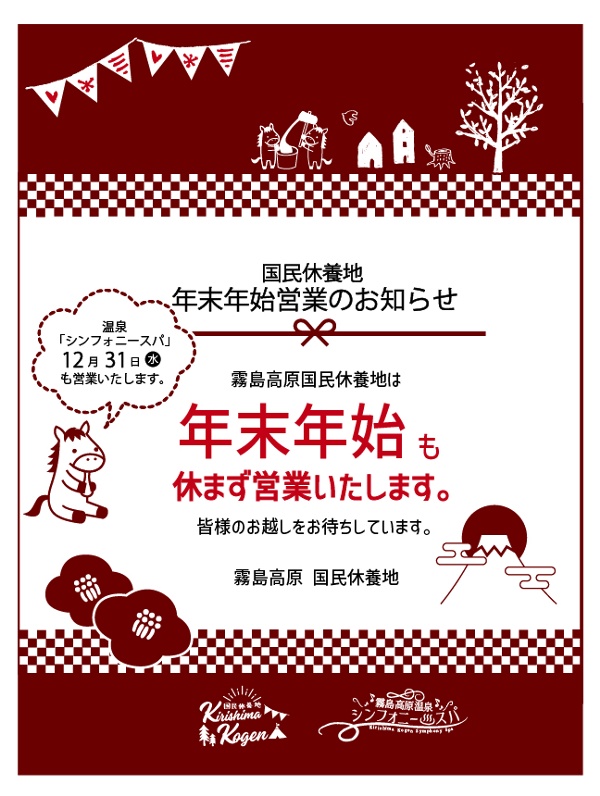 霧島高原 国民休養地は、全施設通常通り営業いたします。 年末年始もキャンプ場・コテージともに、ご利用が可能です。 なお電源サイト、コテージはご予約が必要となります。 ご利用をご検討中のお客様は、お早めのご予約をお願いいたします。 温泉「シンフォニースパ♨」は31日(水)も通常通り営業いたします。 皆様のお越しをスタッフ一同、心よりお待ちしております。 霧島高原国民休養地