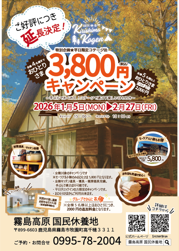 ご好評につきまして、「コテージ泊おひとりさま3,800円キャンペーン」は期間を延長することが決定いたしました。