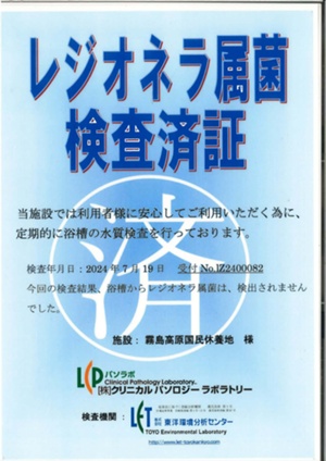 このレジオネラ属菌検査済証は温泉利用者にも見えるように、温泉内ロビーに
