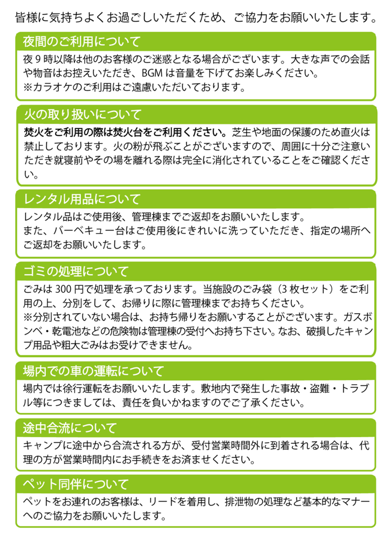 ●キャンプ場内は歩行者優先です。車両は他の利用者に十分注意しながら徐行運転にご協力ください。