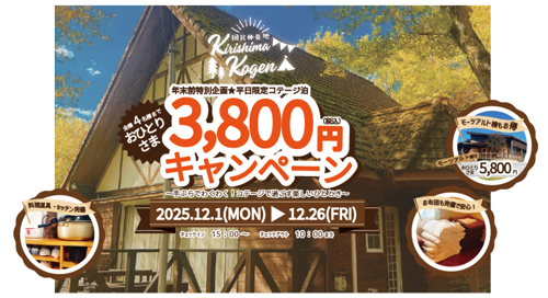 いつも霧島高原 国民休養地をご利用いただき、誠にありがとうございます。 12月1日(月)より26日(金)までの期間、平日限定でお得にご宿泊いただける 「おひとりさま3,800円キャンペーン」がスタートします。期間中は、4名様まで一律でお得にご宿泊いただける特...